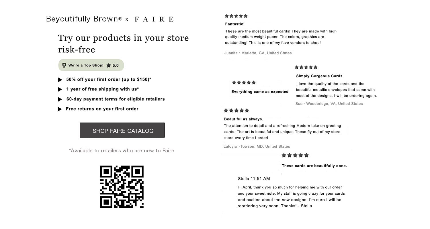 Interested in becoming a wholesaler or collaborating with Beyoutifully Brown? Great! We'd love to hear from you. Wholesale orders can be placed through our marketplace on Faire or by contacting us directly below.
